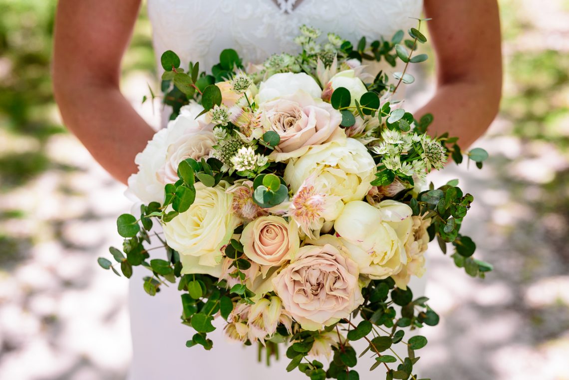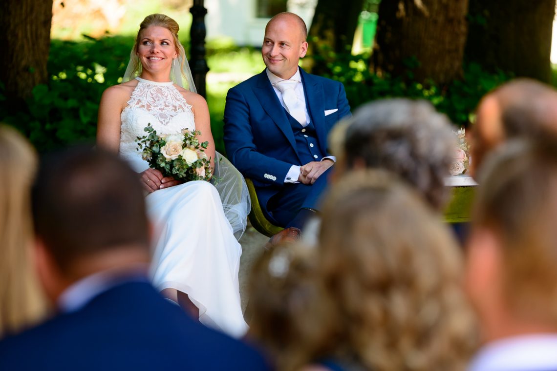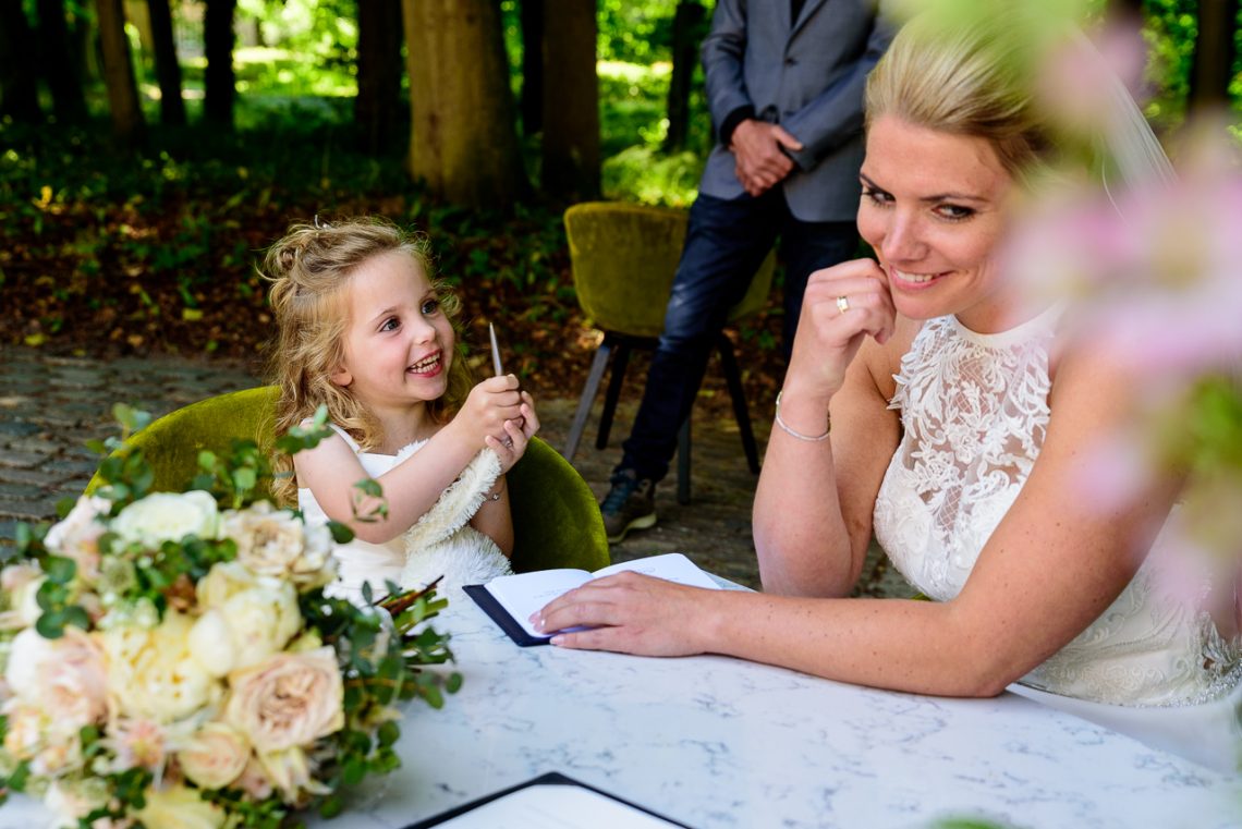 Aan de Eeuwigelaan in Bergen ligt Landgoed Het Hof. Een superromantische plek om te trouwen, als je het ons vraagt. Herman en Daniëlle hadden het perfecte ‘trouwweer’. Zo’n 20 tot 24 graden met een fijn briesje. De trouwceremonie kon dus buiten plaatsvinden. Wat is het toch leuk om je kinderen bij de ceremonie te betrekken en te zien hoe zij alles beleven. De kinderen van het bruidspaar liepen aan het begin van de ceremonie met ze mee naar voren en mochten zelf ook hun handtekening zetten na het jawoord. Wat waren ze trots!