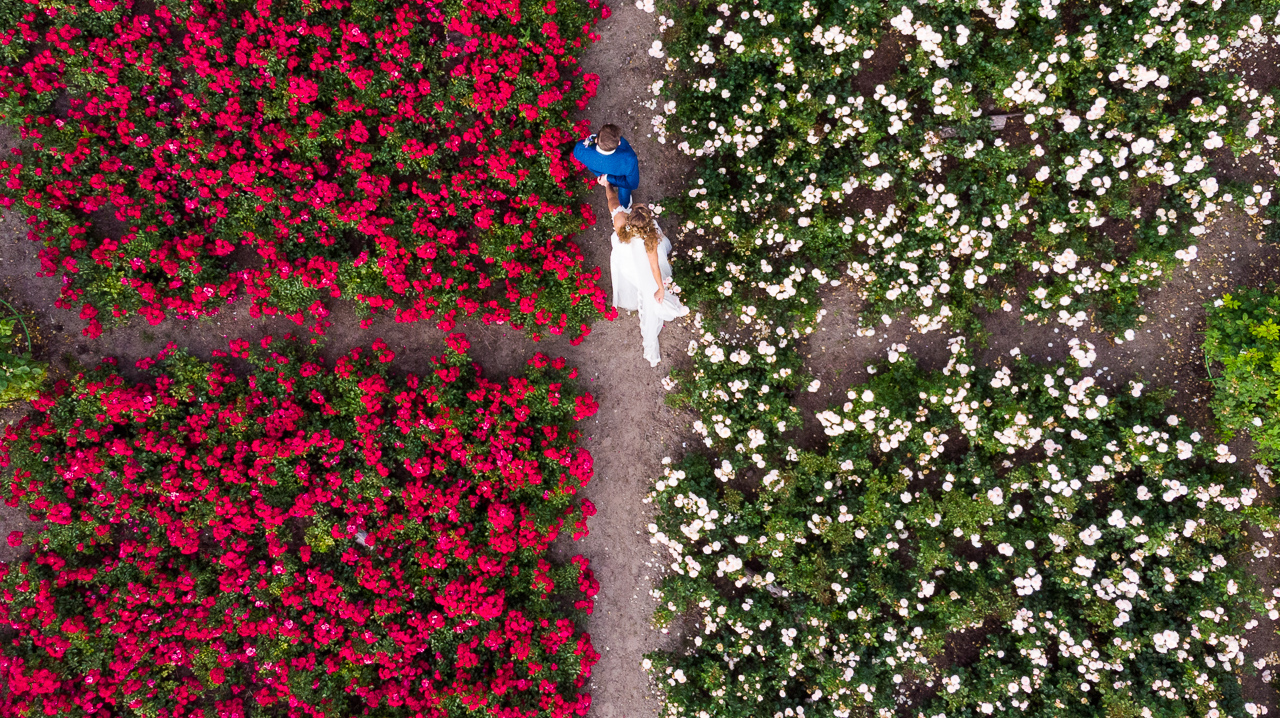 Na de ceremonie, toen we eigenlijk dachten dat het allemaal niet beter kon worden dan dit, spotten we de rozentuin, die in volle glorie bloeide. Echt een plek om de drone de lucht in te laten. En het is een plaatje geworden!