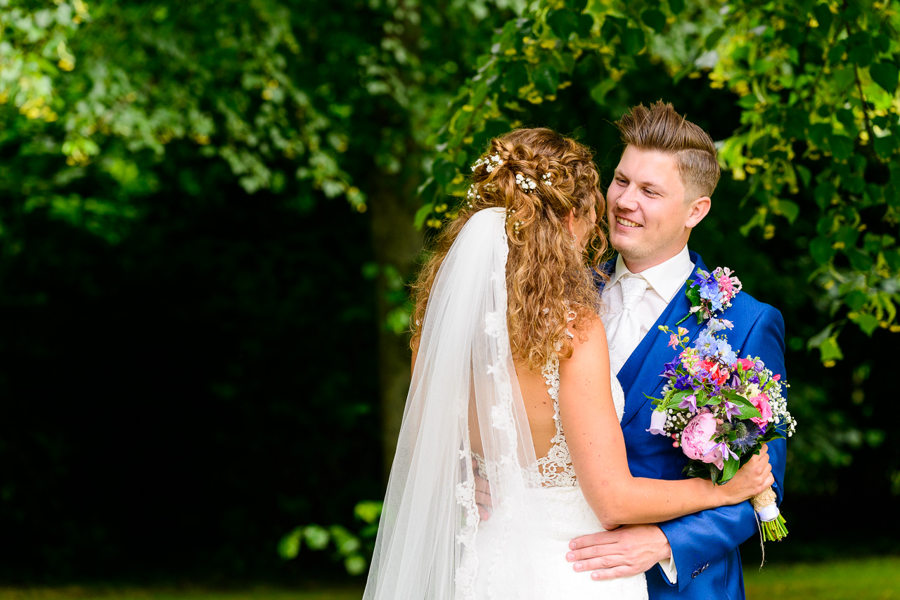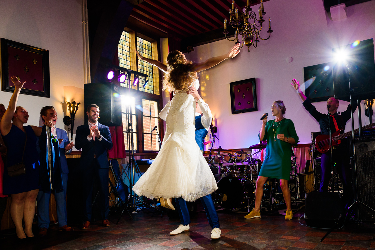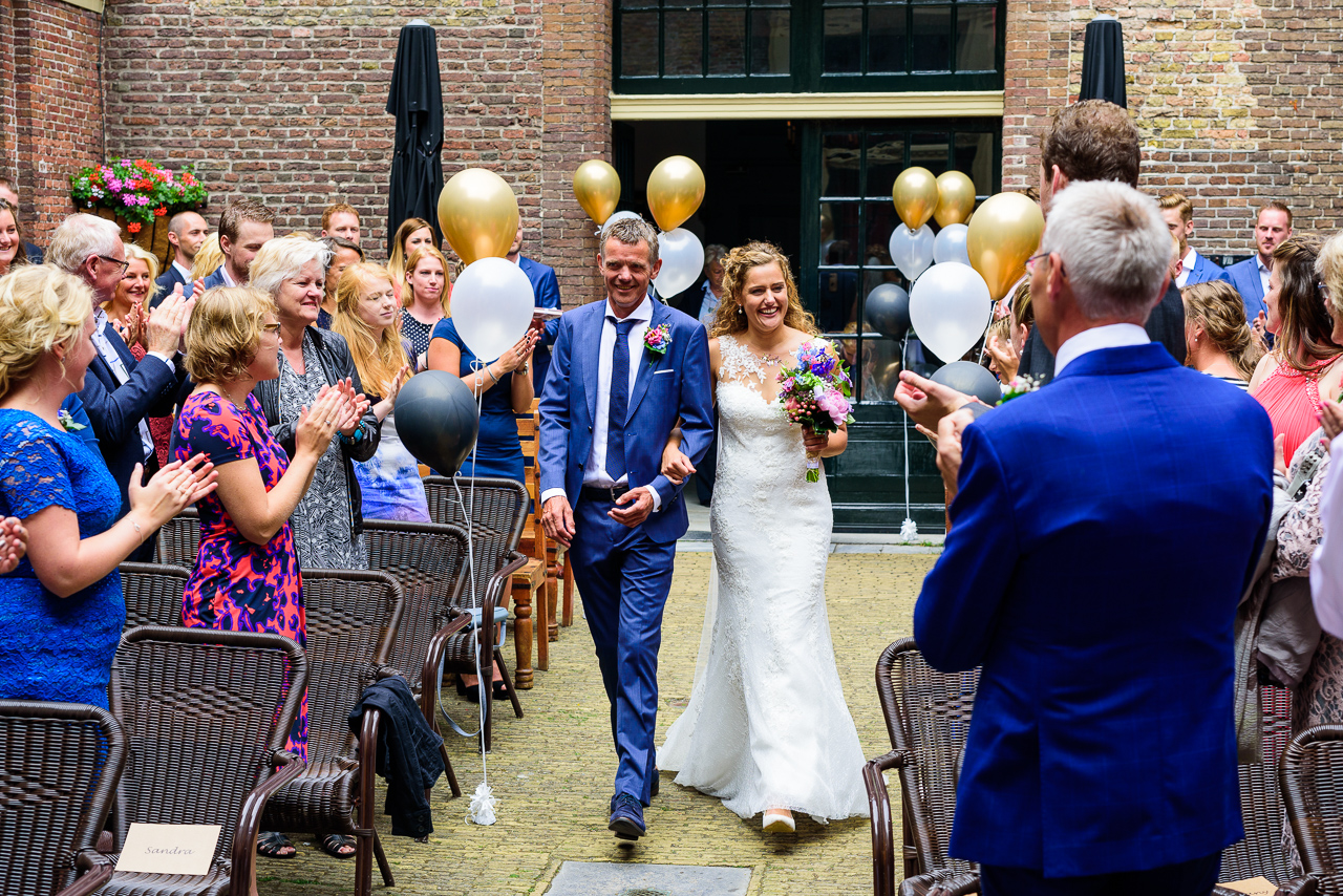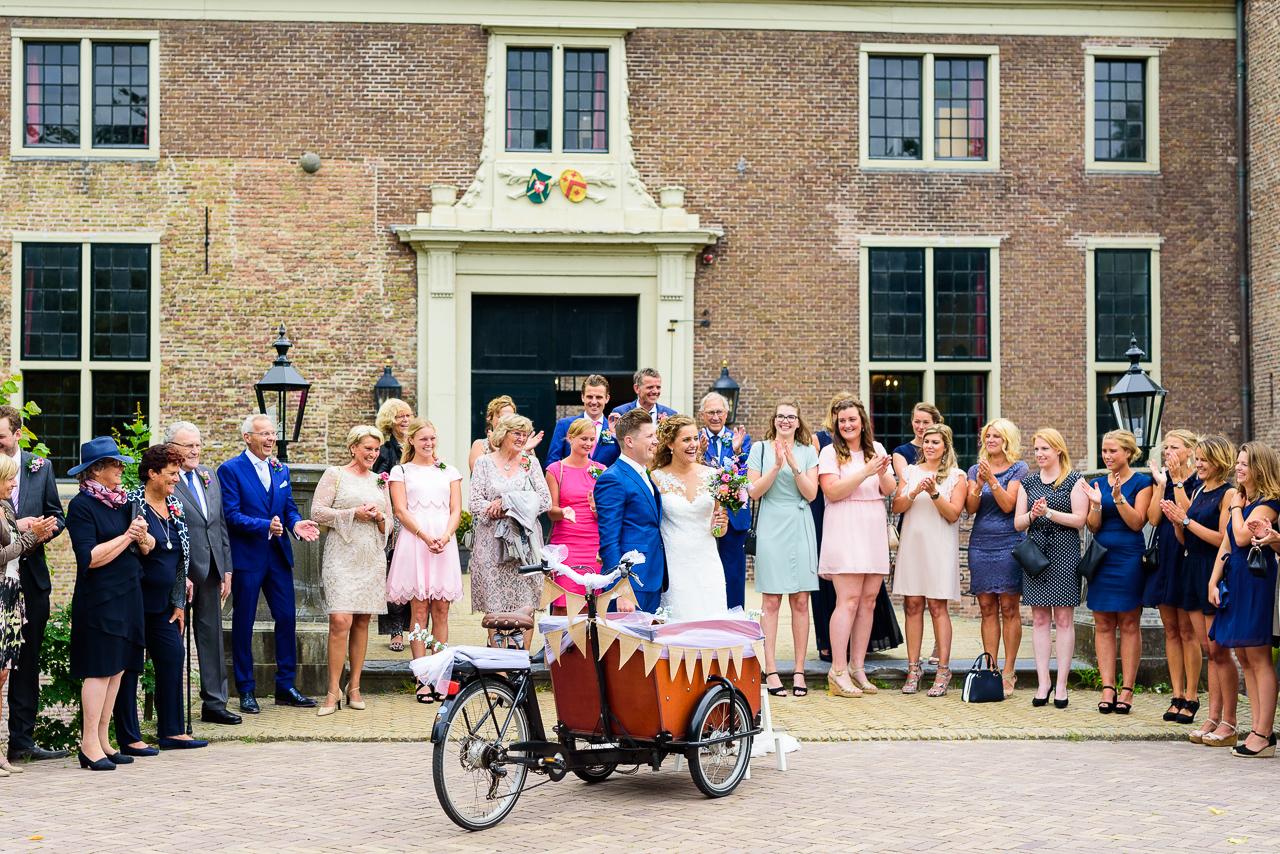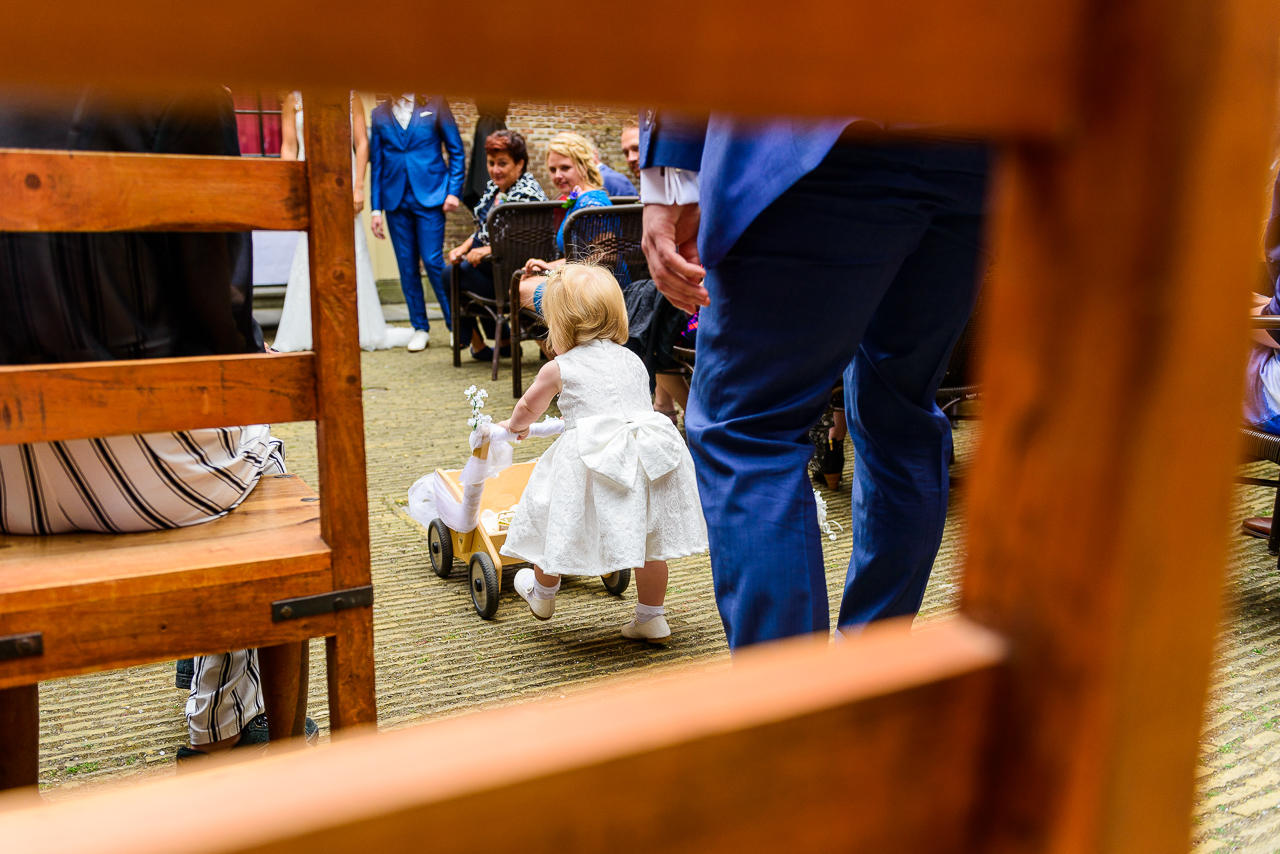 Die ochtend was de entree van Nik al indrukwekkend, maar dit woog ertegenop! De gasten van het bruidspaar hadden zich voor het kasteel verzameld en klapten van enthousiasme toen Nik, met Dionne in de bakfiets, aan kwam fietsen. Het zette meteen de sfeer en lachend verplaatste iedereen zich naar de binnenplaats van het kasteel om de ceremonie bij te wonen. Een mooie, persoonlijke ceremonie met, het kan echt niet anders bij deze twee, heel veel gelach. Ook om het kleine nichtje van het bruidspaar, die vrolijk mee zat te kletsen tijdens de ceremonie en tegen alle verwachtingen in zonder strubbelingen de ringen met naar haar oom en tante bracht. Een feestje om te fotograferen!