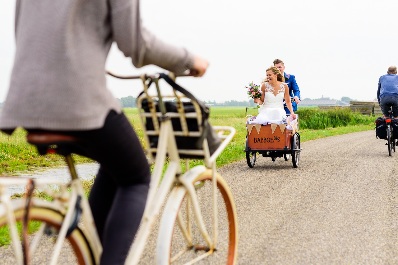Het was een grote verrassing voor de vrienden en familie van Nik en Dionne toen ze Nik de hoek van de staat om zagen komen in een versierde bakfiets. Dit had niemand verwacht! Dionne wist het natuurlijk wel en wachtte hem vol spanning op. Al vrij snel na het ophaalmoment (wel even met een lunch tussendoor) gingen we met z’n vieren op pad voor de fotoreportage. Zij op (en in) de bakfiets, wij met de auto erachteraan. Zo reden we door Heemskerk. Hilarisch was het!