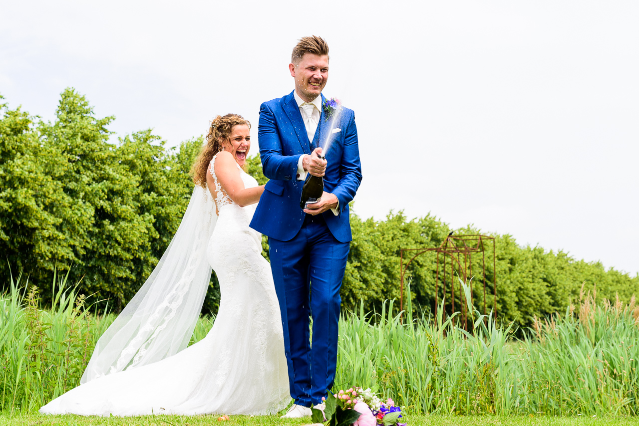 Bij Park Assumburg aangekomen, vonden we de ene na de andere plek om mooie foto’s te kunnen maken. Nik en Dionne zouden later die middag bij Kasteel Assumburg trouwen. Vanuit het park is het kasteel goed te zien. We hebben dus schitterende foto’s met op de achtergrond het kasteel kunnen maken! Tijdens de reportage wilde het bruidspaar ook nog even samen proosten op deze dag. De champagnefles werd uit de bakfiets getoverd en nog even goed geschut. En je raadt het niet… Er spoot geen champagne uit! Dus lagen we weer in een deuk. Even extra schudden en… Dekking zoeken. Dat lukte Dionne wel. Ik lag op de grond met de camera om een extra mooie hoek te pakken, op goed vertrouwen dat Nik niet alle champagne over me heen zou spuiten. Gelukkig kwamen we er allemaal met een paar spetters vanaf. Toen de glazen erbij, waarvan bij een de hals was afgebroken tijdens de bakfietsrit, en proosten maar!